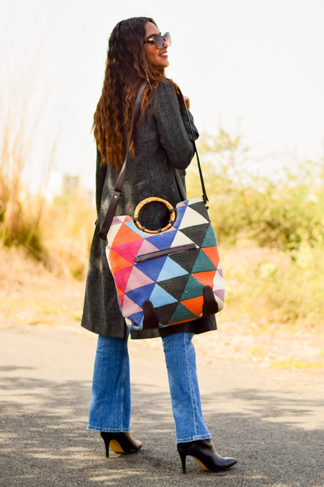 Triangular Tryst Wooden Handle Bag,Traditional Indian Dhurrie Bags