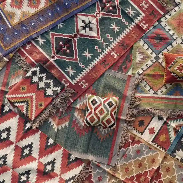 Unique way to display these handmade and hand-knotted kilim rugs for your living rooms, dining room and even bedrooms.