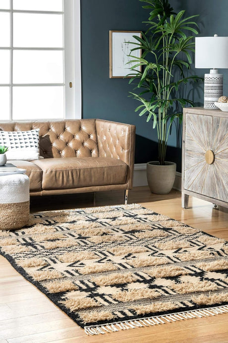 Mona Shaggy Tribal Stripes Wool Area Rug, Luxury Wool Jute Rugs