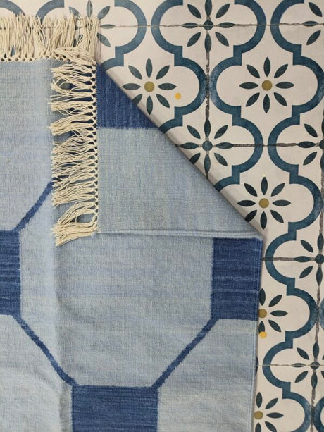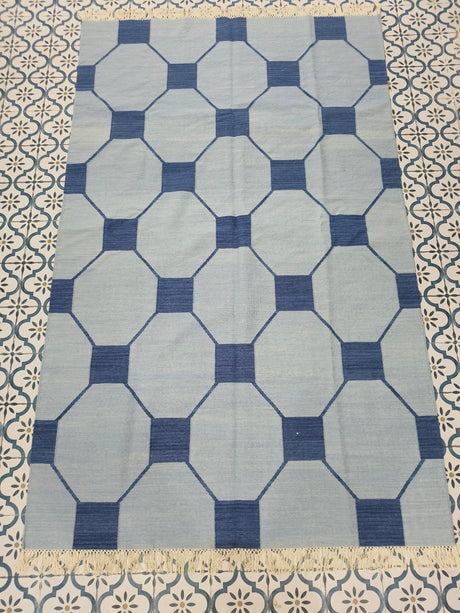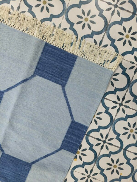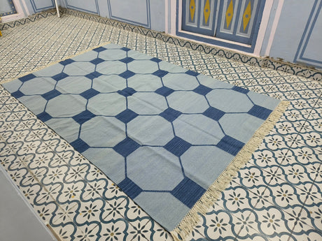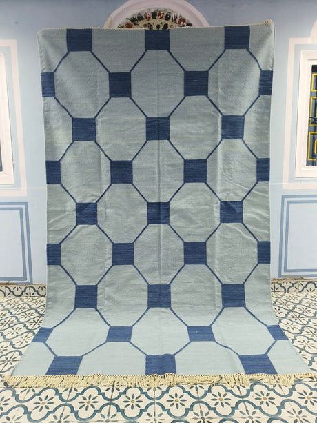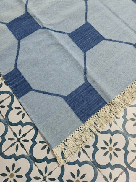 Blue And Navy Neutral Wool Cotton Rug , Handmade Modern Kilim Woven Rug