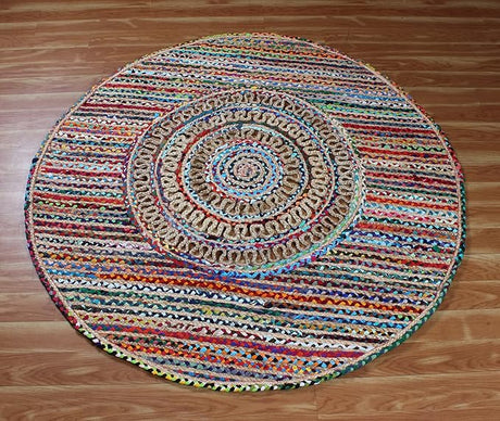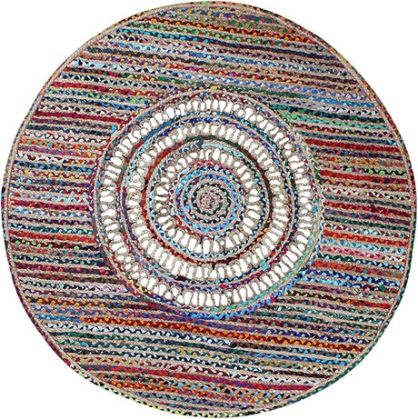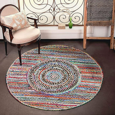 Beige Geometric Chindi Rug – Round Multicolor Cotton Jute Area Mat for Home Decor