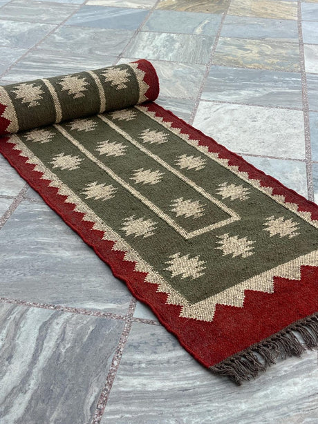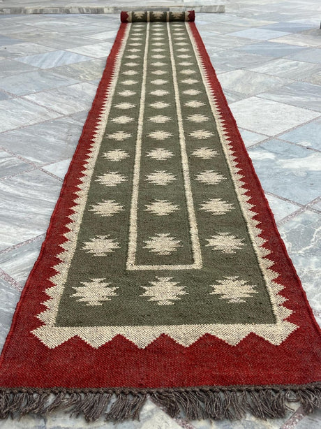 Earthy Tone Olive Green Staircase Runner Rug - Handwoven Jute Kilim